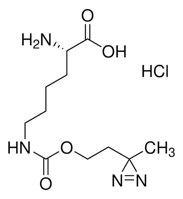 H-L-Photo-lysine HCl is a diazirine-containing lysine amino acid and multifunctional probe building blocks. Its incorporation into peptides or small-molecule probes and tools allows for photoaffinity labeling of cellular targets and protein-protein interactions upon UV light (~360 nm) irradiation to form a covalent bond. This and other multifunctional probe building blocks will continue to accelerate drug discovery research for probing cellular mechanisms, target ID/validation, and understanding traditionally undruggable targets. An Fmoc-protected version is also available as 907383.
