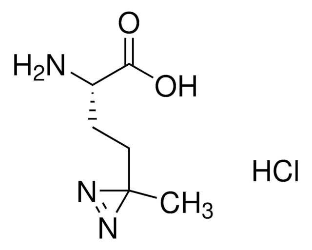 H-L-Photo-Methionine HCl is a diazirine-containing methionine amino acid and multifunctional photo-crosslinker. Its incorporation into peptides or small-molecule probes and tools allows for photoaffinity labeling of cellular targets and protein-protein interactions upon UV light (~360 nm) irradiation to form a covalent bond. This and other multifunctional probe building blocks will continue to accelerate drug discovery research for probing cellular mechanisms, target ID/validation, and understanding traditionally undruggable targets. An Fmoc-protected version is also available as 907367.