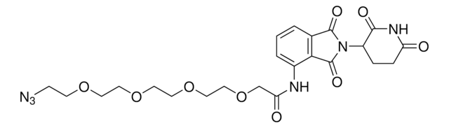 Protein degrader builiding block Pomalidomide-PEG4-Azide enables the synthesis of molecules for targeted protein degradation and PROTAC (proteolysis-targeting chimeras) technology. This conjugate contains a Cereblon (CRBN)-recruiting ligand and a PEGylated crosslinker with pendant azide for click chemistry with a target ligand. Because even slight alterations in ligands and crosslinkers can affect ternary complex formation between the target, E3 ligase, and PROTAC, many analogs are prepared to screen for optimal target degradation. When used with other protein degrader building blocks with a pendant azide, parallel synthesis can be used to more quickly generate PROTAC libraries that feature variation in crosslinker length, composition, and E3 ligase ligand.