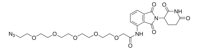 Protein degrader builiding block Pomalidomide-PEG5-azide enables the synthesis of molecules for targeted protein degradation and PROTAC (proteolysis-targeting chimeras) technology. This conjugate contains a Cereblon (CRBN)-recruiting ligand and a PEGylated crosslinker with pendant azide for click chemistry with a target ligand. Because even slight alterations in ligands and crosslinkers can affect ternary complex formation between the target, E3 ligase, and PROTAC, many analogs are prepared to screen for optimal target degradation. When used with other protein degrader building blocks with a pendant azide group, parallel synthesis can be used to more quickly generate PROTAC libraries that feature variation in crosslinker length, composition, and E3 ligase ligand.