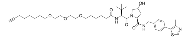 Protein degrader builiding block (S,R,S)-AHPC-C6-PEG3-butyl alkyne enables the synthesis of molecules for targeted protein degradation and PROTAC (proteolysis-targeting chimeras) technology. This conjugate contains a von Hippel-Lindau (VHL)-recruiting ligand, a linker with both hydrophobic and hydrophilic moieties, and a pendant alkyne for click chemistry with an azide on the target ligand. Because even slight alterations in ligands and crosslinkers can affect ternary complex formation between the target, E3 ligase, and PROTAC, many analogs are prepared to screen for optimal target degradation. When used with other protein degrader building blocks with a pendant alkyne group, parallel synthesis can be used to more quickly generate PROTAC libraries that feature variation in crosslinker length, composition, and E3 ligase ligand.