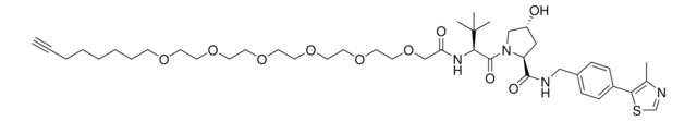 Protein degrader builiding block (S,R,S)-AHPC-PEG6-butyl alkyne enables the synthesis of molecules for targeted protein degradation and PROTAC (proteolysis-targeting chimeras) technology. This conjugate contains a von Hippel-Lindau (VHL)-recruiting ligand, a linker with both hydrophobic and hydrophilic moieties, and a pendant alkyne for click chemistry with an azide on the target ligand. Because even slight alterations in ligands and crosslinkers can affect ternary complex formation between the target, E3 ligase, and PROTAC, many analogs are prepared to screen for optimal target degradation. When used with other protein degrader building blocks with a pendant alkyne group, parallel synthesis can be used to more quickly generate PROTAC libraries that feature variation in crosslinker length, composition, and E3 ligase ligand.