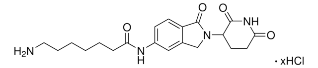 Protein degrader builiding block C5 Lenalidomide-C6-NH2 hydrochloride enables the synthesis of molecules for targeted protein degradation and PROTAC (proteolysis-targeting chimeras) technology. This conjugate contains a Cereblon (CRBN)-recruiting ligand with alternative exit vector and an alkyl-chain crosslinker with pendant amine for reactivity with an acid on the target warhead. Because even slight alterations in ligands, warheads, and crosslinkers can affect ternary complex formation between the target, E3 ligase, and PROTAC, many analogs are prepared to screen for optimal target degradation. When used with other protein degrader building blocks with a terminal amine, parallel synthesis can be used to more quickly generate PROTAC libraries that feature variation in crosslinker length, composition, and E3 ligase ligand.