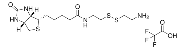 Biotinamidoethyldisulfanyl(2-aminoethane) trifluoroacetic acid (Biotin-SS-NH2 TFA) is a cleavable, biotinylated crosslinkers. The linker can also be used for synthesis of chemical biology tools for labeling target proteins in biological experiments and assays. It possesses dual functionality: enrichment via the biotin and an embedded disulfide bridge for cleavage under reducing conditions.