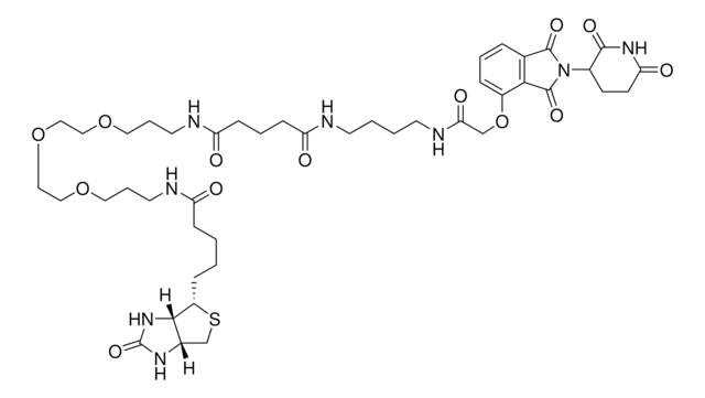 Biotin-Thalidomide (bio-Thal) is a cereblon affinity probe for PROTAC® and targeted protein degradation research. Bio-Thal can be used in cereblon (CRBN) binding and displacement assays for protein degrader validation experiments, CRBN ligand discovery, competition analyses, or where enrichment of CRBN complexes is required.