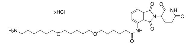 Protein degrader building block Pomalidomide-C6-PEG1-C3-PEG1-butyl amine hydrochloride enables the synthesis of molecules for targeted protein degradation and PROTAC (proteolysis-targeting chimeras) technology. This conjugate contains a Cereblon (CRBN)-recruiting ligand, a linker with both hydrophobic and hydrophilic moieties, and a pendant amine for reactivity with an acid on the target warhead. Because even slight alterations in ligands and crosslinkers can affect ternary complex formation between the target, E3 ligase, and PROTAC, many analogs are prepared to screen for optimal target degradation. When used with other protein degrader building blocks with a terminal amine, parallel synthesis can be used to more quickly generate PROTAC libraries that feature variation in crosslinker length, composition, and E3 ligase ligand.