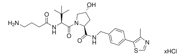 Protein degrader building block (S,R,S)-AHPC-C3-NH2 hydrochloride enables the synthesis of molecules for targeted protein degradation and PROTAC (proteolysis-targeting chimeras) technology. This conjugate contains a von Hippel-Lindau (VHL)-recruiting ligand and an alkyl-chain crosslinker with pendant amine for reactivity with an acid on the target warhead. Because even slight alterations in ligands, warheads, and crosslinkers can affect ternary complex formation between the target, E3 ligase, and PROTAC, many analogs are prepared to screen for optimal target degradation. When used with other protein degrader building blocks with a terminal amine, parallel synthesis can be used to more quickly generate PROTAC libraries that feature variation in crosslinker length, composition, and E3 ligase ligand.