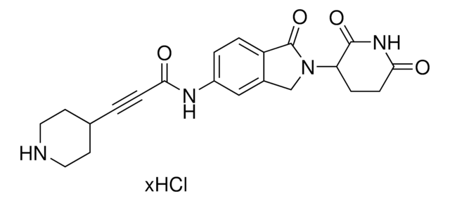 Protein degrader building block C5 Lenalidomide-alkyne-piperidine hydrochloride enables the synthesis of molecules for targeted protein degradation and PROTAC (proteolysis-targeting chimeras) technology. This conjugate contains a Cereblon (CRBN)-recruiting ligand with alternative exit vector, a linker with added rigidity, and a pendant amine for reactivity with a carboxylic acid on the target ligand. Because even slight alterations in ligands and crosslinkers can affect ternary complex formation between the target, E3 ligase, and PROTAC, many analogs are prepared to screen for optimal target degradation. When used with other protein degrader building blocks with a terminal amine, parallel synthesis can be used to more quickly generate PROTAC libraries that feature variation in crosslinker length, composition, and E3 ligase ligand.