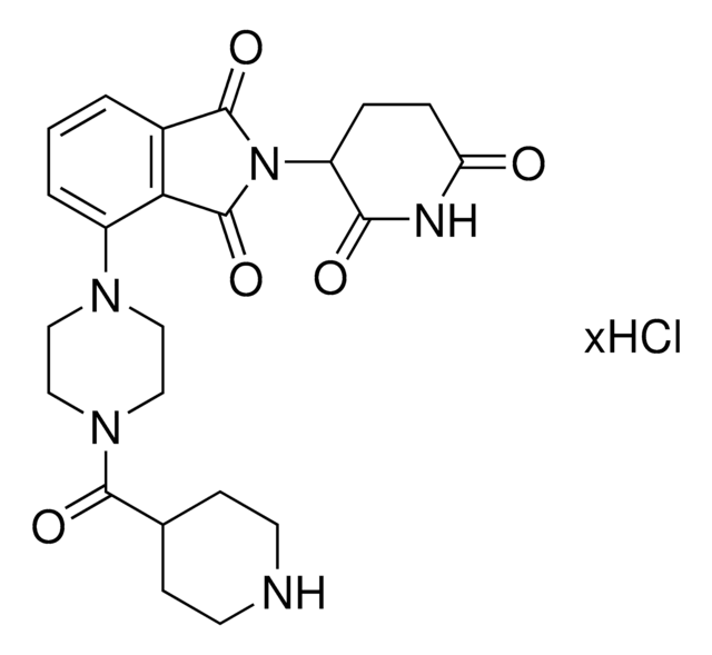 Protein degrader building block Pomalidomide-piperazine-piperidine-4-carboxamide hydrochloride enables the synthesis of molecules for targeted protein degradation and PROTAC® (proteolysis-targeting chimeras) research. This conjugate contains a Cereblon (CRBN) recruiting ligand, a rigid linker, and a pendant amine for reactivity with a carboxylic acid on the target ligand. Because even slight alterations in ligands and crosslinkers can affect ternary complex formation between the target, E3 ligase, and degrader, many analogs are prepared to screen for optimal target degradation. When used with other protein degrader building blocks with a terminal amine, parallel synthesis can be used to more quickly generate degrader libraries that feature variation in crosslinker length, composition, and E3 ligase ligand.