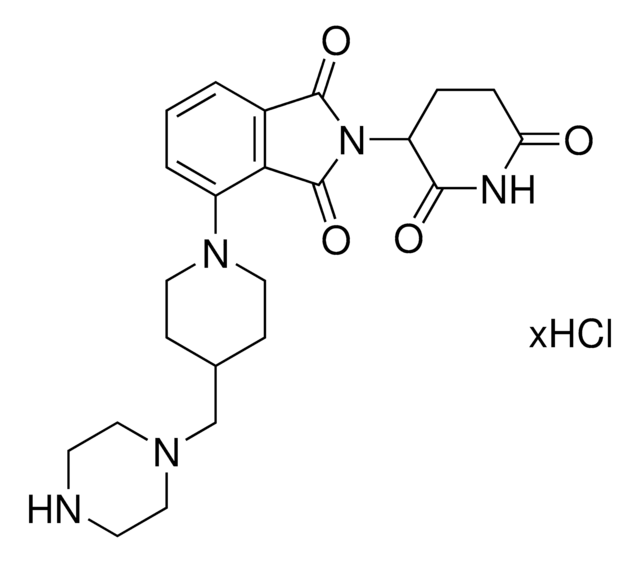 Protein degrader building block Pomalidomide-4-piperidine-C1-piperazine hydrochloride enables the synthesis of molecules for targeted protein degradation and PROTAC® (proteolysis-targeting chimeras) research. This conjugate contains a Cereblon (CRBN) recruiting ligand, a rigid linker, and a pendant amine for reactivity with a carboxylic acid on the target ligand. Because even slight alterations in ligands and crosslinkers can affect ternary complex formation between the target, E3 ligase, and degrader, many analogs are prepared to screen for optimal target degradation. When used with other protein degrader building blocks with a terminal amine, parallel synthesis can be used to more quickly generate degrader libraries that feature variation in crosslinker length, composition, and E3 ligase ligand.
