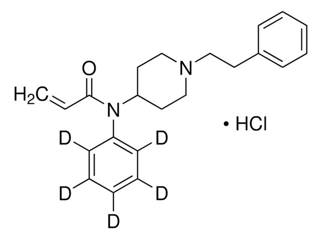 This stable-labeled internal solution standard is suitable for quantitation of acryl fentanyl levels in urine, serum, or plasma by LC/MS or GC/MS for clinical toxicology, urine drug testing or forensic analysis applications. Acryl fentanyl, also known as acryloylfentanyl, is a highly potent opioid analgesic fentanyl analog that is sold as designer drug and abused recreationally.