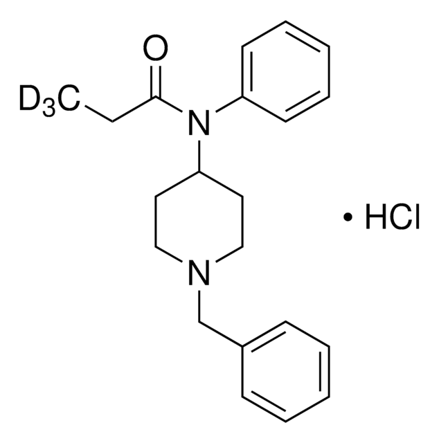 Benzylfentanyl, also known as R-4129, is a fentanyl analog that is sold and abused as designer drug. This stable-labeled internal solution standard is suitable for quantitation of benzylfentanyl levels in urine, serum, or plasma by LC/MS or GC/MS for clinical toxicology, urine drug testing or forensic analysis applications.