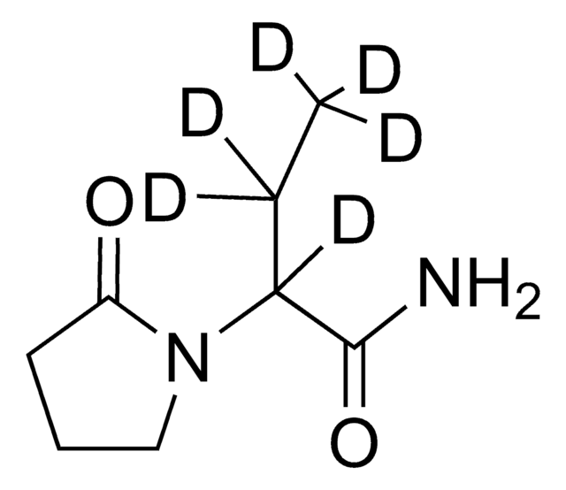 Suitable uses for this certified solution standard include as an internal standard for quantitation of levetiracetam levels in biological matrices such as urine or isotope dilution methods by LC/MS or GC/MS for clinical toxicology, urine drug testing, or forensic analysis applications. Levetiracetam, marketed under the trade name Keppra®, is an antiepileptic drug used primarily for treatment of seizures along with occasional use in treating neuropathic pain.