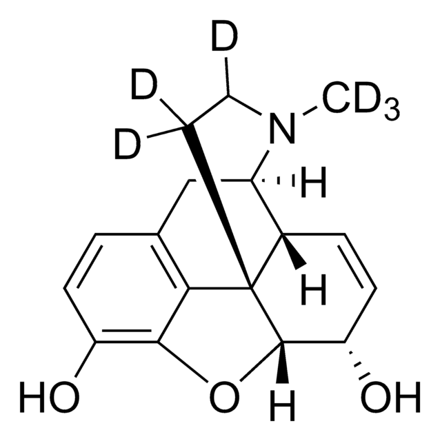 This stable-labeled internal standard is suitable for quantiation of morphine levels in urine, serum, or plasma by LC/MS or GC/MS for urine drug testing, pain prescription monitoring, clinical toxicology, forensic analysis, or isotope dilution methods. Morphine is a very potent opiate analgesic drug used to relieve both acute and chronic severe pain. Sold under trade names including MS Contin®, Kadian®, Oramorph®, and Roxanol, morphine is also a commonly abused recreational drug due to its widespread availability and high potential for addiction.