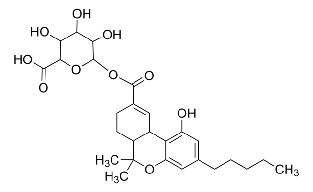 The Certified Spiking Solution® is suitable for (+)-11-Nor-Δ9-THC-9-carboxylic acid glucuronide testing by HPLC, GC/MS, or LC-MS/MS methods in forensic analysis, clinical toxicology, urine drug testing, and Cannabis potency or impurity profiling testing applications. The Certified Reference Material (CRM) in solution can also be used as follows: