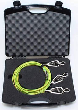 If flammable liquids (e.g. solvents) are to be withdrawn or filled, the container must be properly grounded according to valid safety regulations to avoid explosions and fire risks. The relevant measures are to be taken to discharge static electricity. This can be done by using the antistatic device set. It contains 3 cables for highest flexibility in grounding containers during all work steps. It comes in a suitcase for safe and professional storage of cables that are currently not in use. Cable length: 2 m