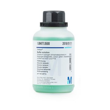 The green-colored di-sodium hydrogen phosphate/potassium dihydrogen phosphate buffer solution is gravimetrically prepared using high-quality reagents at a registered calibration laboratory. Its pH value of 7.00 at 20°C is measured following a 5-point calibration method, using a combined glass electrode. The measurement is made following DIN 19268 using reference buffer solutions compliant to DIN 19266, NIST, IUPAC, Ph. Eur, and USP. Its pH value is strongly dependent on the temperature and therefore a constant temperature must be maintained during its use.