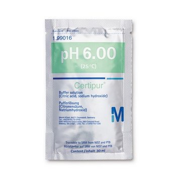 It is a citric acid/sodium hydroxide certified buffer solution, gravimetrically prepared using high-quality reagents and water at a registered calibration laboratory. Its pH value of 6.00 at 25°C is determined using the 5-point calibration method with a combined glass electrode. The measurement is made following DIN 19268 using reference buffer solutions compliant to DIN 19266, NIST, IUPAC, Ph. Eur, and USP. The buffer′s pH value strongly depends on the temperature and therefore a constant temperature must be maintained during its use.