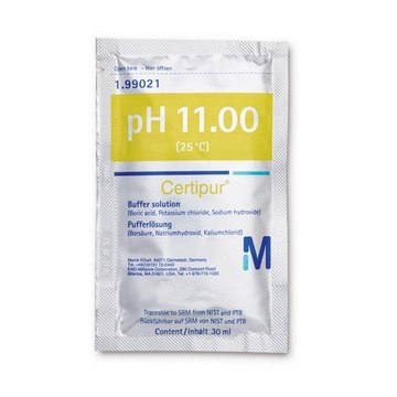 The boric acid/sodium hydroxide/potassium chloride buffer solution is gravimetrically prepared at a registered calibration laboratory with high-quality reagents and water. Its pH value of 11.00 at 25°C is measured using a combined glass electrode following a 5-point calibration method. The measurement is made following DIN 19268 using reference buffer solutions compliant to DIN 19266, NIST, IUPAC, Ph. Eur, and USP. The buffer pH strongly depends on the temperature and therefore a constant temperature must be maintained during its use.