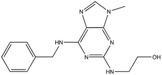 A purine derivative that acts as a potent, reversible and selective inhibitor of p34cdk1/cyclin B (IC50 = 7 µM) and related kinases including p33cdk2/cyclin A (IC50 = 7 µM), p33cdk2/cyclin E (IC50 = 7 µM), p33cdk5/p35 (IC50 = 3 µM), and p44 MAP kinase (IC50 = 25 µM). Acts by competing for the ATP binding domain of the kinase. Exhibits reduced sensitivity towards related kinases, p34cdk4/cyclin D (IC50 >1 mM), and p40cdk6/cyclin D3 (IC50 >250 µM). Does not significantly affect the activity of other protein kinases at 1 mM. Known to inhibit DNA synthesis in interleukin-2-stimulated T lymphocytes and trigger G1 arrest similar to that observed in interleukin-2-deprived cells. Also used to synchronize cells in G1. A 50 mM (5 mg/336 µl) solution of Olomoucine (Cat. No. 495624) in DMSOis also available.