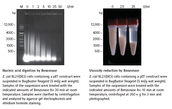 Benzonase Nuclease is available in ultrapure (> 99% by SDS-PAGE) and pure (> 90%) grades at a standard concentration of 25-29 U/µl and at a high concentration (HC) of 250 U/µl. Both preparations are free of detectable protease and have specific activity> 1 × 106 U/mg protein. The > 99% purity grade is tested for endotoxins and contains< 0.25 EU/1000 units. The product is supplied in 50% glycerol. Store at -20°C.