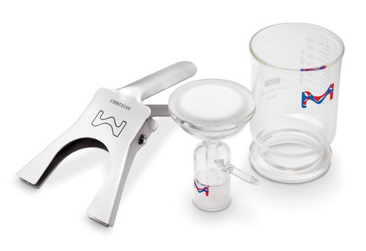 The Millipore All-Glass Filter Holder was designed for the filtration of aqueous and organic or corrosive liquids for particulate contamination analysis. The holder can also be used for HPLC solvent preparation. The vacuum connection is integrated into the filter holder base and flask cap, above the filtrate exit level. With this design, you can avoid unintentionally drawing filtrate into vacuum tubing. This design also allows simple transfer of filtrate (i.e., HPLC solvents) by pouring from the receiver flask.