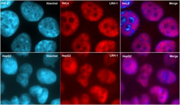 Western Blot Analysis: A 1:1,000 dilution from representative lot detected Liver receptor homolog-1 in HepG2 and HeLa cell lysates (M. Oulad, IGBMC, France.).