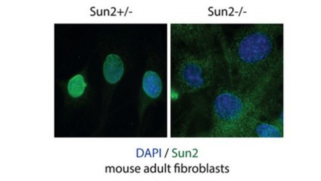 This mouse monoclonal Anti-SUN2 Antibody, clone 3.1E, Cat. No. MABT880, is validated for use in Immunocytochemistry and Western Blotting for the detection of SUN2.