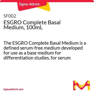 ESGRO Complete™ Basal Medium is a defined serum-free medium developed for use as a base medium for differentiation studies, for serum free culture of ES cells when used with LIF and BMP, and during routine washing steps when passaging cells.