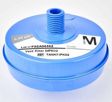 This vent filter is designed to protect purified water stored in 30/60/100 liter PE storage tanks from airborne contaminants. It is used when the reservoir is fed with RiOs™ reverse osmosis (RO, Type 3) product water.