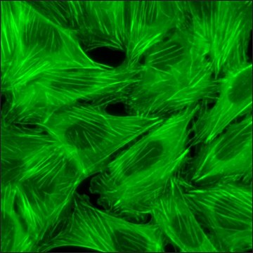 This product is a human U2OS cell line in which the genomic ACTB gene has been endogenously tagged with a Green Fluorescent Protein (GFP) gene using CompoZr® Zinc Finger Nuclease technology. Integration resulted in endogenous expression of the fusion protein in which GFP is attached to the N-terminus of actin. Fluorescence imaging shows that the actin can polymerize to form the characteristic pattern of actin filaments. This stable cell line was expanded from a single clone. The target′s gene regulation and corresponding protein function are preserved in contrast to cell lines with overexpression via an exogenous promoter.