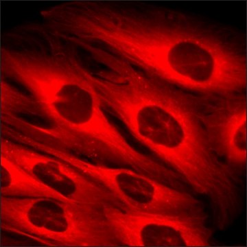 This product is a human U2OS cell line in which the genomic TUBA1B gene has been endogenously tagged with a Red Fluorescent Protein (RFP) gene using CompoZr® Zinc Finger Nuclease technology. Integration resulted in endogenous expression of the fusion protein in which RFP is attached to the N-terminus of tubulin. Fluorescence imaging shows that the tubulin can polymerize to form the characteristic pattern of microtubules. This stable cell line was expanded from a single clone. The target′s gene regulation and corresponding protein function are preserved in contrast to cell lines with overexpression via an exogenous promoter.