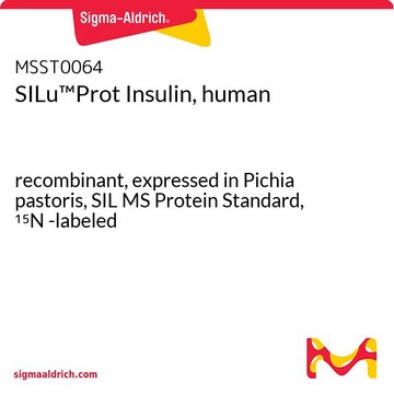 SILu Prot Insulin is a recombinant, stable 15N isotope-labeled human Insulin Expressed in P. pastoris, it is designed to be used as an internal standard for bioanalysis of Insulin in mass-spectrometry. SILu Prot Insulin is a disulfate bonded hetero-dimer protein composed of two chains. Chain A of 21 amino acids and a thoretical amolecular mass of 2408.5; Chain B of 30 amino acids and a thoretical amolecular mass of 3468.7 (Note that Thr30 in chain B is not 15N labeled).