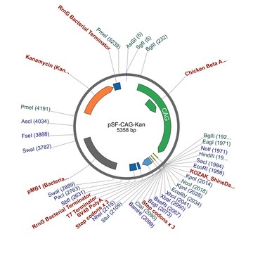 PSF-CAG-KAN-CAG promoter vector, a mammalian expression vector contains the chimeric CAG promoter which is a composite of the CMV (cytomegalovirus) enhancer the chicken beta actin promoter (CBA) and the rabbit beta globin intron. This promoter is often used instead of the CMV promoter because in some cell types the CMV promoter can get silenced. To prevent this the CAG promoter contains the CpG island from the CBA promoter to help prevent promoter methylation. The plasmid can be used to drive protein expression in a range of mammalian cell types and we have consistently found that expression levels are equal to CMV in short term experiments in standard cell types.