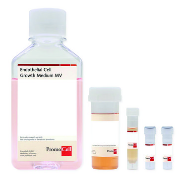 Endothelial Cell Growth Medium MV is a low-serum (5% V/V) medium developed for the in vitro cultivation of endothelial cells from microvascular vessels, the coronary artery, and the aorta. The media are optimized for primary human cells but can also be used for bovine, porcine, murine, rat and dog endothelial cells from microvascular vessels as well as for various endothelial cell lines.Recommended for:Human Dermal Microvascular Endothelial Cells (HDMEC)Human Coronary Artery Endothelial Cells (HCAEC)Human Aortic Endothelial Cells (HAoEC)Human Pulmonary Microvascular Endothelial Cells (HPMEC)Human Dermal Lymphatic Endothelial Cells (HDLEC)Human Dermal Blood Endothelial Cells (HDBEC)Human Cardiac Microvascular Endothelial Cells (HCMEC)Human Uterine Microvascular Endothelial Cells (HUtMEC)Note: For best transfection results we recommend using PromoCell heparin-free Endothelial Cell Growth Medium MV2. Heparin, included all our other our Endothelial Cell Growth Media formulations, may reduce transfection efficiency.