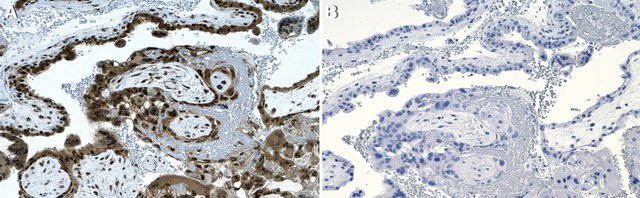 Immunohistochemistry (Paraffin) Analysis: A 1:100 dilution from a representative lot detected Cyclin E in Human placenta tissue sections.