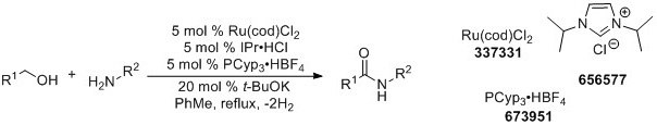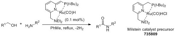 In 2007, Milstein and coworkers reported the ruthenium-catalyzed dehydrogenative coupling of amines and alcohols to give amide products.3