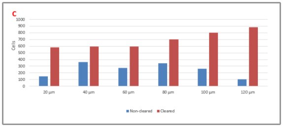 Nuclei stained with SYTOX green; A) Non-cleared spheroid; B) Cleared spheroid; Z-projections are outlined in white. Z-projections mask difficulty of imaging non-cleared microtissues since Z-projections hide the eclipsing that occurs in imaging. Cleared microtissues show no eclipsing while interior cells are visible. Outlines of cells detected by CellProfiler in InSphero NCI-H2170 lung cancer microtissues treated with 100 nM cisplatin. 20 µm optical-sections (20-120 um) shown left to right for A) Non-cleared microtissues and B) Microtissues cleared with Visikol® HISTO-M™; C) Cell counts for each Z-plane in cleared and non-cleared microtissues from A) and B). Far more cells can be detected at each Z-plane in cleared microtissues.
