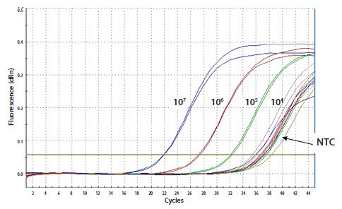 Figure 11.2.Amplification of a 10-fold serial dilution of a DNA template. The replicates are precise but the ΔCq is inconsistent, decreasing with increasing dilutions. The data also shows a positive signal in the no template control (NTC) indicating contamination or primer dimer formation and that the dilutions to less than 105 copies have identical data to the NTC.
