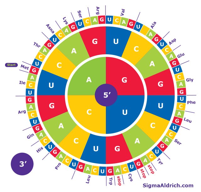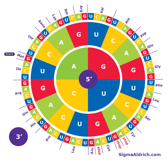Use this amino acid codon wheel during RNA translation to discover the amino acids related to your sequence.